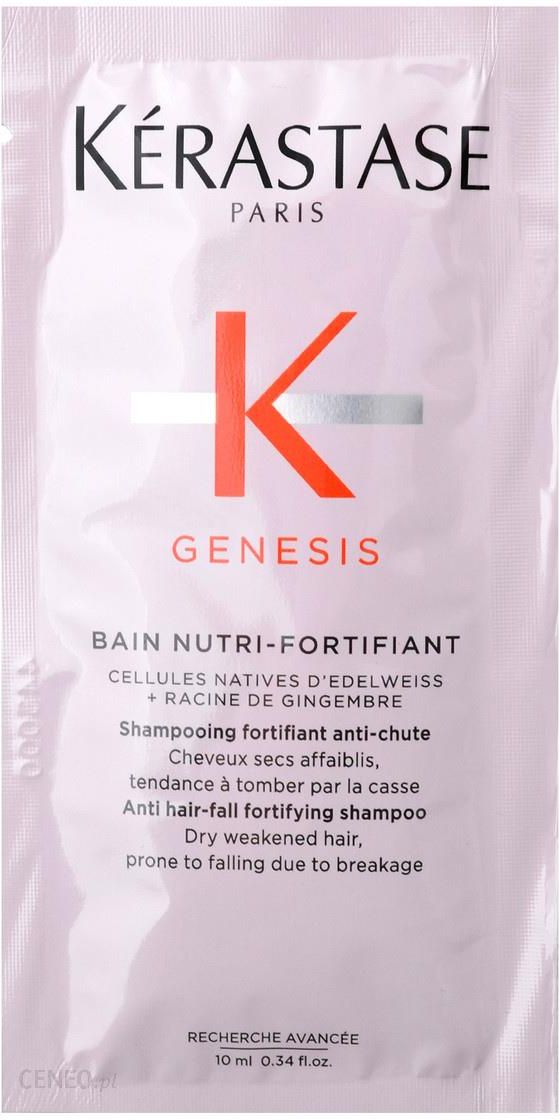 Kerastase Genesis Bain Nutri-Fortifiant 10mlSzampon odżywczo-wzmacniający do włosów osłabionych i podatnych na wypadanie.Włosy słabe ze skłonnością do wypadania wymagają odpowiedniej pielęgnacji, którą najlepiej rozpocząć od szamponu. Wybierając produkty marki Kerastase, możemy zapewnić naszym kosmykom wzmocnienie i odpowiednią ochronę.Kerastase Genesis Bain Nutri-Fortifiant to delikatny szampon do włosów, zapewniający dobre oczyszczenie, przy jednoczesnej gwarancji wzmocnienia kosmyków i zmniejszenia ryzyka ich wypadania z powodu pękania. Szampon przeciw wypadaniu włosów delikatnie nawilża włosy od nasady, aż po końce sprawiając, że stają się one na nowo miękkie, gładkie i podatne na układanie. Produkt zapobiega plątaniu się włosów i wytwarza zdrowe środowisko do ich wzrostu. W jego składzie znajdziemy:korzeń imbiru – zapewnia ochronę przed szkodliwymi czynnikami zewnętrznymikomórki szarotki alpejskiej – wykazują działanie przeciwutleniające i konserwujące kolagenZalety stosowania:zapobieganie wypadaniu włosówochrona przed czynnikami szkodliwymiwzmocnienie włosówprzywrócenie miękkości i wygładzenieułatwienie stylizacjistymulacja wzrostuSposób użycia:Szampon nałożyć na wilgotne, przesuszone ręcznikiem włosyPo nałożeniu szamponu dodaj wodę i spień je razemWmasuj szampon w skórę głowy i we włosy, aż po końce do powstania pianyDokładnie spłuczPojemność:10ml