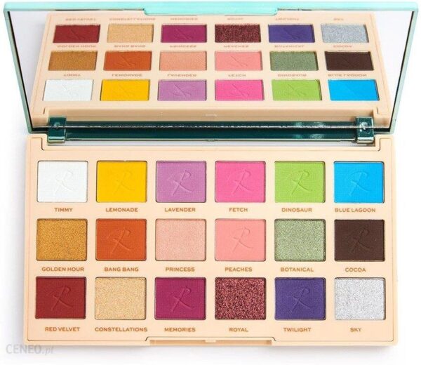 Roxi – ROXXSAURUS COLOUR BURST PALETTE marki MAKEUP REVOLUTION. Paleta cieni. Powstała przy współpracy ze znaną Youtuberką Roxxsaurus. Składa się z 18 prasowanych pudrów o matowym i perłowym wykończeniu. Dzięki dobrze przemyślanej, odważnej kolorystyce umożliwi stworzenie przeróżnych makijaży oka. Cienie posiadają dobrze napigmentowaną, nie osypującą się formułę, dzięki czemu doskonale sprawdzą się nawet w rękach osoby dopiero rozpoczynającej pracę z makijażem oka. Całość została umieszczona w eleganckiej czarnej palecie z lusterkiem.Paleta cieni do powiek.Zawiera pudry o różnych wykończeniach.Posiada delikatną, nie osypującą się formułę.Przeznaczona dla profesjonalistów jak i amatorów. POSZCZEGÓLNE ODCIENIE:- TIMMY – biały (matowy),- LEMONADE – żółty (matowy),- LAVENDER – lawendowy (matowy),- FETCH – różowy (matowy),- DINOSAUR – limonkowo zielony (matowy),- BLUE LAGOON – błękitny (matowy),- GOLDEN HOUR – czyste złoto (perłowy),- BANG BANG – rdzawy (matowy),- PRINCESS – brzoskwiniowy (perłowy),- PEACHES – łososiowy (matowy),- BOTANICAL – jasny oliwkowy (perłowy),- COCOA – czekoladowy (matowy),- RED VELVET – wiśniowo czerwony (matowy),- CONSTELLATIONS – perłowo-złoty (perłowy),- MEMORIES – różowo-fioletowy (matowy),- ROYAL – brązowo-czerwony (perłowy),- TWILIGHT – śliwkowy (matowy),- SKY – srebrny (perłowy).