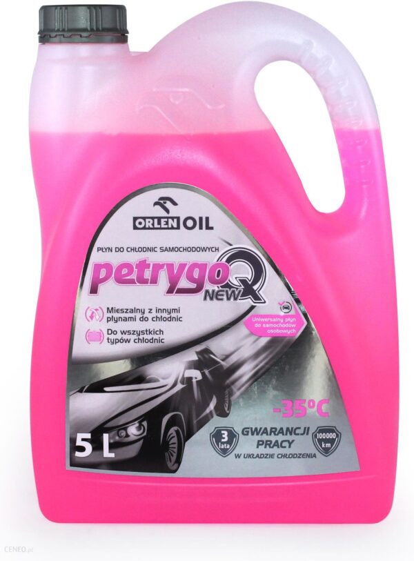 ORLEN Płyn do chłodnic Petrygo Q NEW -35 st. Różowy 5 litrów CharakterystykaNowa formuła najpopularniejszego w Polsce płynu chłodzącego. Płyn do chłodnic Petrygo Q NEW produkowany jest w oparciu o wysokiej jakości glikol etylenowy oraz specjalnie dobrany pakiet dodatków uszlachetniających, które zapewniają pełną ochronę układów chłodzenia wykonanych z aluminium, innych stopów metali oraz w układach mieszanych. Płyn tworzy w układzie chłodzenia wyjątkowo odporną powłokę ochronną, zabezpieczając go przed korozją i kawitacją w zakresie eksploatacji do 100 tyś km lub przez 3 lata eksploatacji. Jest odporny na zamarzanie do -35°C i zapewnia doskonałą ochronę silnika przed przegrzaniem. Petrygo Q NEW jest neutralny do stosowanych w układach chłodzenia elementów wykonanych z tworzyw sztucznych. Zoptymalizowana technologia gwarantuje dużą stabilność płynu w czasie długotrwałego przechowywania jak i w trakcie użytkowania. Jest mieszalny z innymi płynami chłodniczymi spełniającymi równorzędne parametry.** producent pojazdu rekomenduje poziom jakości dla płynu chłodzącego, który zapewnia maksymalną ochronę układu chłodzącego.Nie zawiera toksycznych azotynów, krzemianów, amin, boranów i fosforanów. • chroni układ chłodzący przed korozją i kawitacją• bezpieczny dla elementów gumowych i z tworzyw sztucznych• gwarantowana temperatura krystalizacji -35°C• chroni układ przed przegrzaniem• zabezpiecza przed nadmiernym powstawaniem osadów i kamienia• bezpieczny dla środowiska naturalnegoZastosowanieJest to środek uniwersalny nadający się do stosowania w układzie chłodzenia każdego silnika samochodowego zarówno w nowoczesnych, zbudowanych głównie z aluminium, jak i w starszych typach silników. Może być mieszany z wszystkimi, dostępnymi na rynku płynami chłodzącymi. Płyn Petrygo Q NEW może być przechowywany przez okres 5 lat od daty produkcji. Okres eksploatacji płynu w układzie chłodzenia wynosi minimum 3 lata lub 100 tys. kilometrów.Płyn gotowy do użycia. Stosować zgodnie z instrukcją obsługi zalecaną przez producenta samochodu. Sugerowane uzupełnianie ubytków płynem Petrygo Q i Petrygo Q NEW.Termin przydatności: 5 lat od daty przedstawionej na opakowaniuNormy, aprobaty, specyfikacjeSpełnia wymagania norm: polskiej PN-C 40007:2000, amerykańskiej ASTM D 3306-03 i brytyjskiej British Standard BS 6580.Wyrób wyprodukowano zgodnie z systemem zarządzania jakością PN-EN ISO 9001:2008Parametry fizyko-chemiczneParametr Jednostki Wartości Typowe barwa różowa gęstość w 20°C [g/ml] 1,065 temperatura wrzenia [°C] 107 pH 7,5 temperatura krystalizacji [°C] -35Uwaga: Powyższe wartości parametrów fizykochemicznych są wartościami typowymi. Wartości rzeczywiste są umieszczane na świadectwach jakości dołączanych do każdej partii produktu.