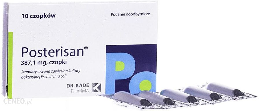 PosterisanWskazania: świąd, sączenie i pieczenie okolicy odbytu spowodowane guzkami krwawniczymi.Skład: 1 czopek zawiera: 387,1mg standaryzowanej zawiesiny kultury bakteryjnej Escherichia coli. Pozostałe składniki: tłuszcz stały, makrogologlycerolu hydroksystearynian.Działanie: uśmierza ból, eliminuje świąd i pieczenie, wpływa na miejscową regenerację tkanek oraz gojenie się ran, zwiększa odporność chorych miejsc na zakażenie bakteryjne, wskazany także przy szczelinach (bolesnych pęknięciach) i przetokach w kanale odbytu.Dawkowanie: zazwyczaj należy stosować czopki dwa razy na dobę, rano i wieczorem, najlepiej po wypróżnieniu, wprowadzając czopek głęboko do odbytnicy.Przeciwwskazania: jeśli pacjent ma uczulenie na substancję czynną lub którykolwiek z pozostałych składników tego leku.
