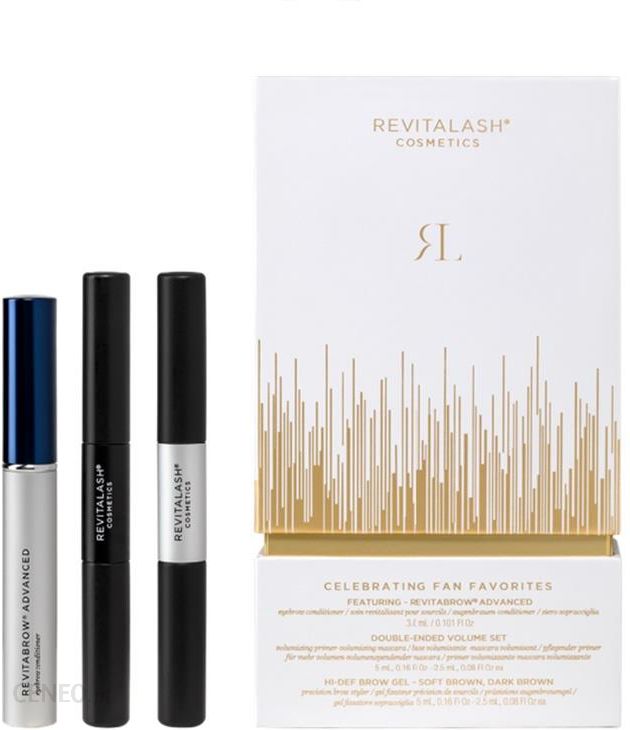 Revitalash Celebrating Fan Favourites Gold to zestaw luksusowych kosmetyków do brwi i rzęs składający się z ulubionych produktów tej marki znajdujący się w prezentowym opakowaniu.Zestaw zawiera:• kultową odżywkę do brwi Revitalash EyeBrow Advanced 3ml,• maskarę Revitalash Double Ended Vole Set 2×2,5ml,• żel do brwi Revitalash Hi-Def Brow Gel jasny brąz 2,5ml + ciemny brąz 2,5 ml.Kultowa odżywka do rzęs RevitaLash Eyelash Advanced pozwoli Ci się cieszyć długimi, zdrowymi i pięknymi rzęsami. Opatentowana formuła łącząca naturalne wyciągi roślinne z najnowszymi technologiami umożliwiła stworzenie produktu, który nawilża, odżywia i wzmacnia rzęsy. Opatentowana technologia Biopetin Complex zawiera peptydy, biotynę, lipidy oraz ekstrakt z zielonej herbaty bogaty w pantenol. Dzięki tym składnikom pomaga odżywić, wzmocnić i zmiękczyć rzęsy, a zarazem chroni je przed uszkodzeniami i łamaniem.Revitalash Double Ended Vole Set to innowacyjny, czarny tusz do rzęs. Specjalna receptura produktu zmienia na lepsze wygląd Twoich rzęs. Rzęsy będą pełniejsze i bardziej kuszące niż kiedykolwiek. Formuła zapobiega zlepianiu się i rozmazywaniu, oddziela i definiuje rzęsy. Wodoodporna mascara zapewnia trwałość przez cały dzień.Unikalny produkt do stylizacji brwi Revitalash Hi-Def Brow Gel pozwoli Ci podkreślić, dodać objętości i charakteru brwiom. Opatentowana formuła łącząca peptydy, elastyczne polimery i mineralny żel podkreśla kolor brwi i odżywia je. Już niewielka ilość produktu działa wzmacniająco na brwi, chroniąc je przed uszkodzeniami i wypadaniem, a mineralny żel pomaga uzyskać głębię naturalnego koloru brwi i delikatnie je przyciemnia.