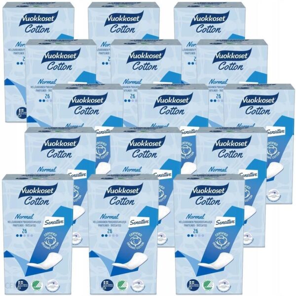 OPAKOWANIE ZBIORCZE, TANIEJ 5%Wypróbuj przyjazne skórze, oddychające wkładki higieniczne! Zaprojektowane z myślą o wrażliwej skórze wkładki Vuokkoset Cotton Normal gwarantują komfort użytkowania oraz poczucie świeżości na co dzień. Miękka bawełna, z której wykonana jest powierzchnia wkładek, pochodzi z certyfikowanych upraw organicznych, dzięki czemu nie musisz się martwić o ryzyko wystąpienia podrażnień.Wszystkie produkty Vuokkoset są starannie przebadane pod kątem dermatologicznym, nie zawierają dodatków zapachowych oraz zbędnych substancji chemicznych, jak oparte na chlorze wybielacze, mikroplastiki czy dioksyny. Wszystko po to, żeby zagwarantować bezpieczeństwo najbardziej wrażliwym częściom Twojego ciała.Budowa wkładki (zdjęcie nr 3):1. Wierzchnia warstwa z bawełny organicznej zapewnia komfort, jest wyjątkowo miękka i oddychająca.2. Ledwie zauważalna warstwa chłonna jest naprawdę cienka, a mimo to równomiernie rozprowadza wilgoć wewnątrz wkładki higienicznej.3. Naturalny rdzeń pochodzi prosto z pulpy z fińskich lasów.4. Niezawodna przyczepność utrzymuje wkładkę na miejscu.Certyfikaty:- Allergy and Asthma Federation- Nordic EcolabelW opakowaniu: 26 sztuk wkładek higienicznych o długości 155 mm i grubości 2 mm2 w pięciostopniowej skali chłonności.
